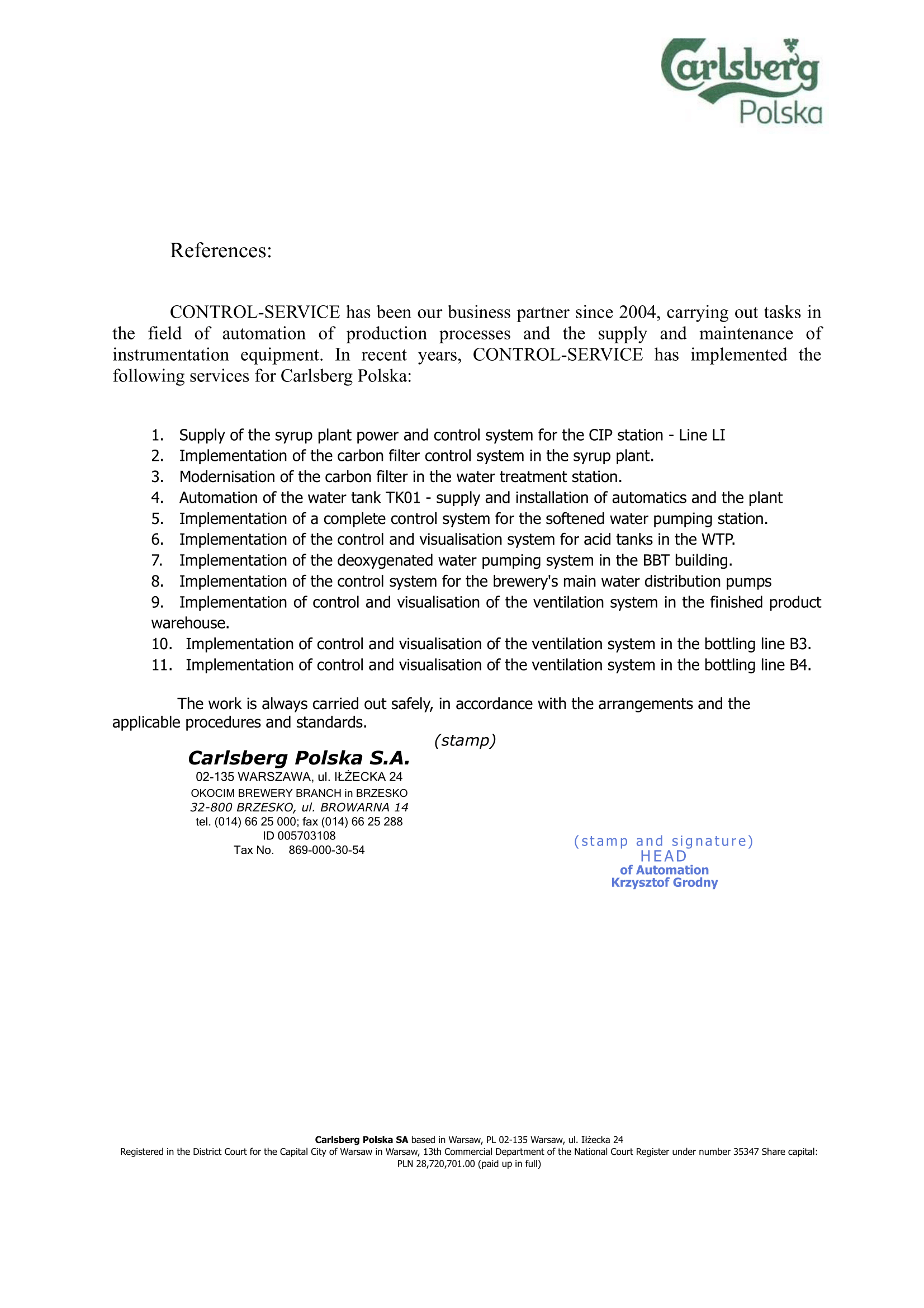 As a leader in the automation industry, we have so far cooperated with many large brands and medium and small companies from the food&beverage, construction, energy, metallurgy, automotive and pharmaceutical industries. Our solutions were used by, among others: Carlsberg Group, Azoty Gropu, ZGH Bolesław, Philip Morris International, Śnieżka, Kompania Piwowarska, Orlen, Enea, EDF and Coca-Cola. We approach each order with full commitment, which has already been appreciated by many of our clients.