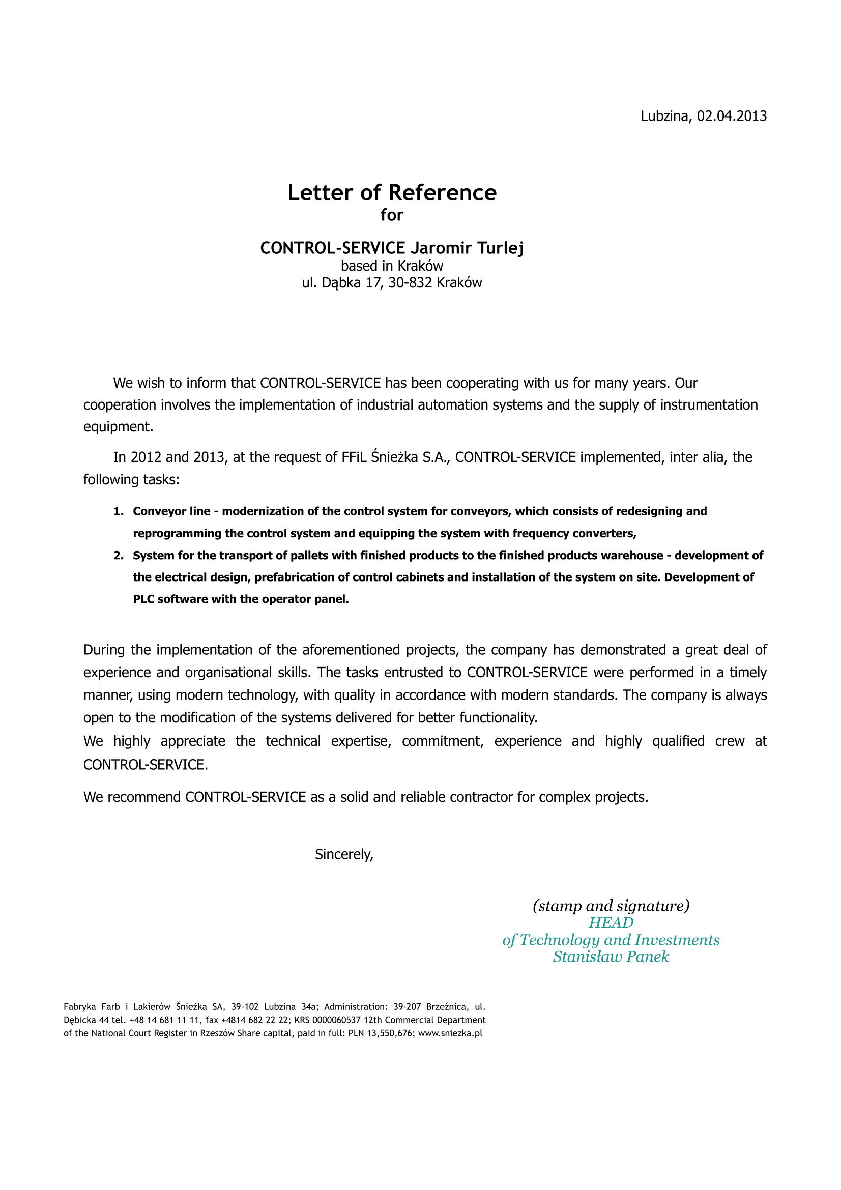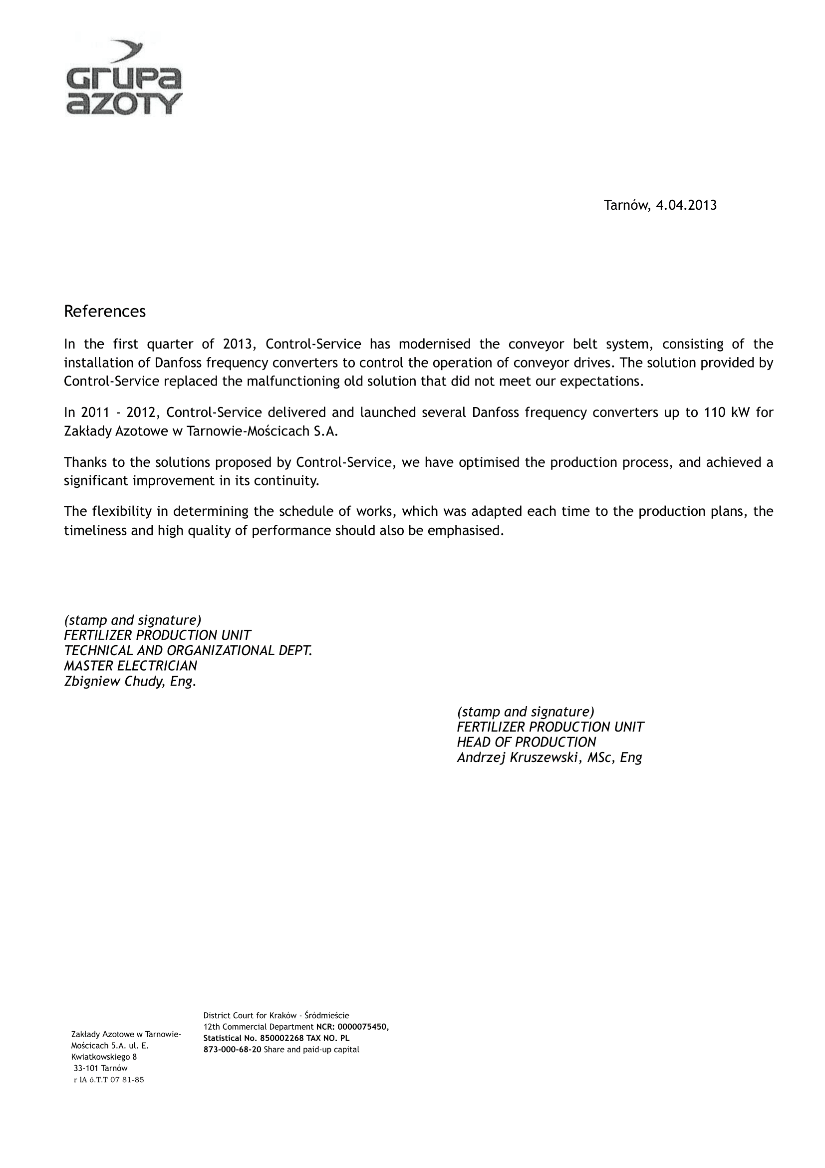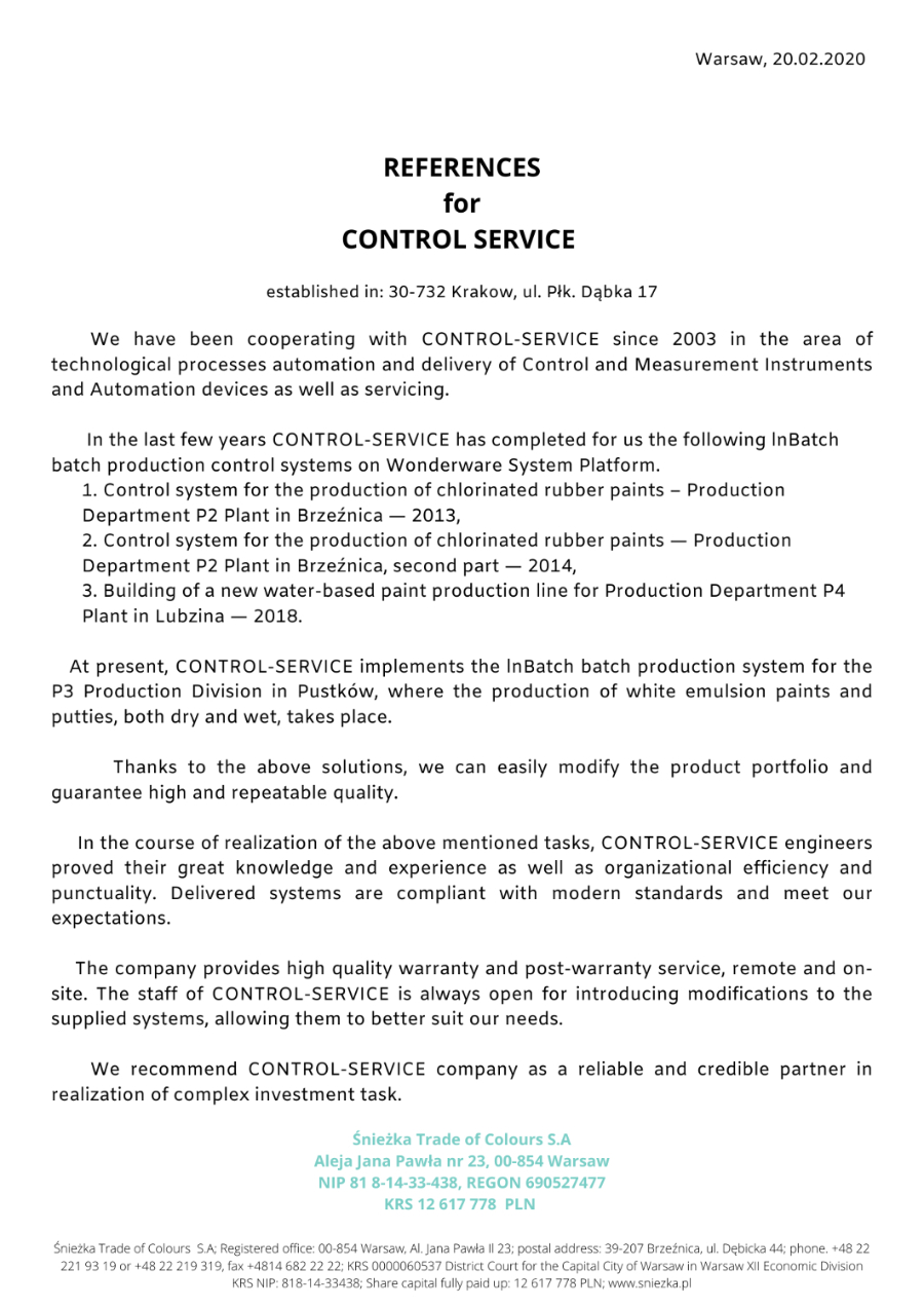 Recent years have been a time of intensive work, development and improvement of technology for our company. Over the course of 5 years, we have manufactured over 350 control systems and sold 1,200 frequency converters and soft starters. We hope that the coming years will bring just as much good for us and our clients. Therefore, here we share with you the opinions that our current partners have given us.